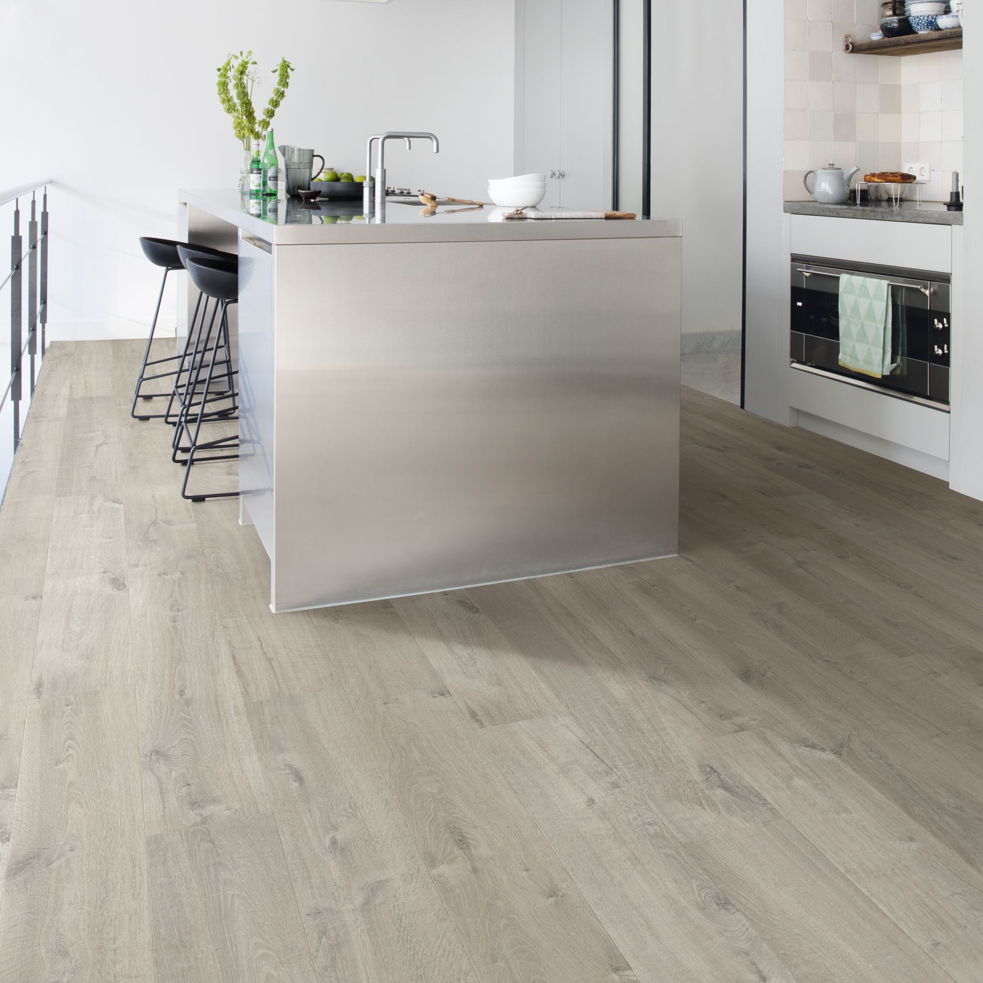 Light grey laminate flooring kitchen.